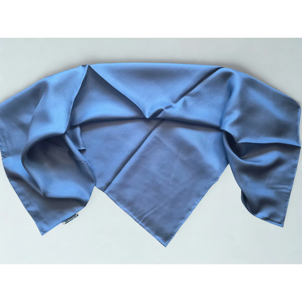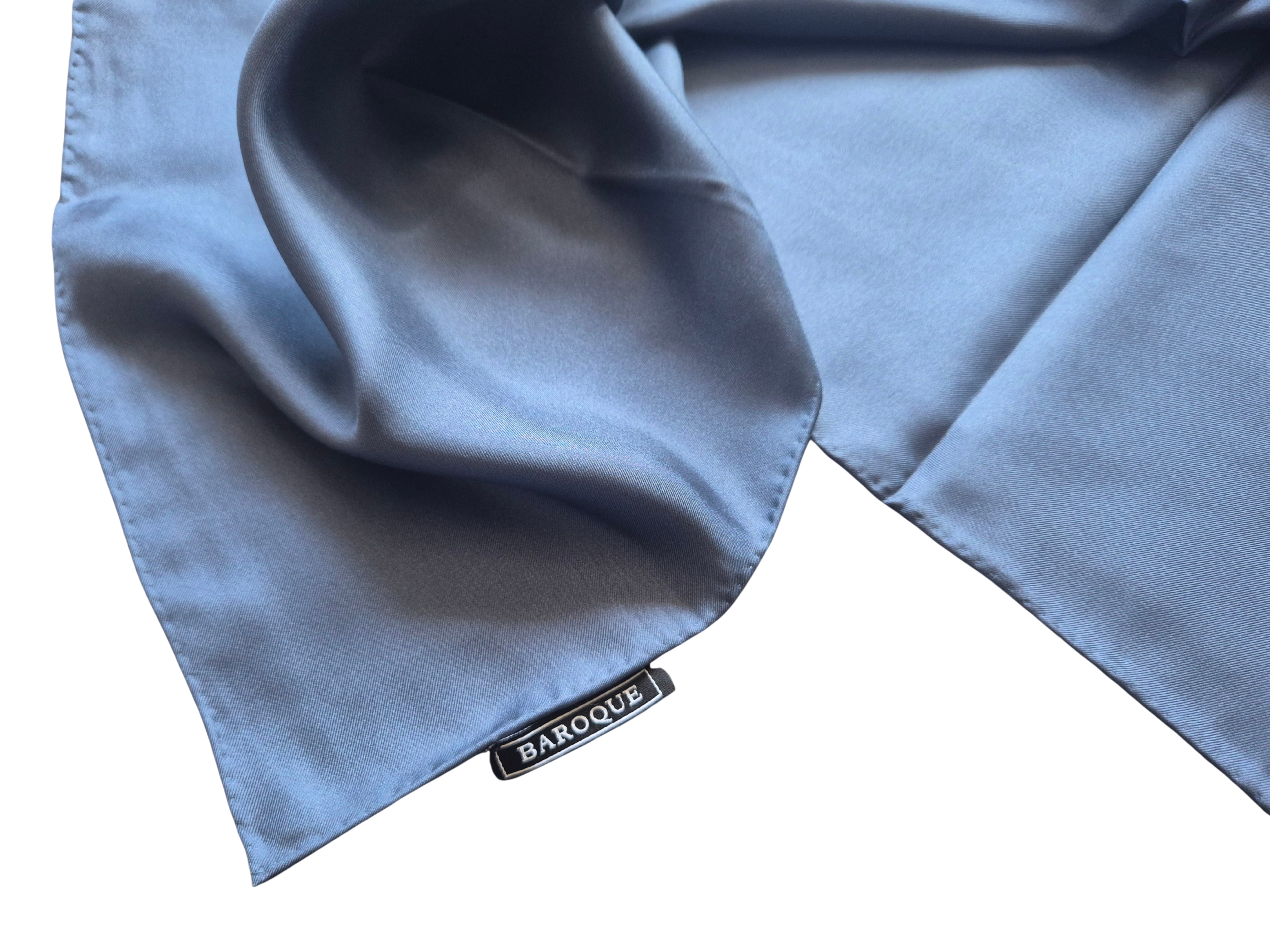 A beautitul steely cornflower blue colour plain. Just want your collection needs.. and it sits and ties just as beautifully as any baroque pattened scarf does!!