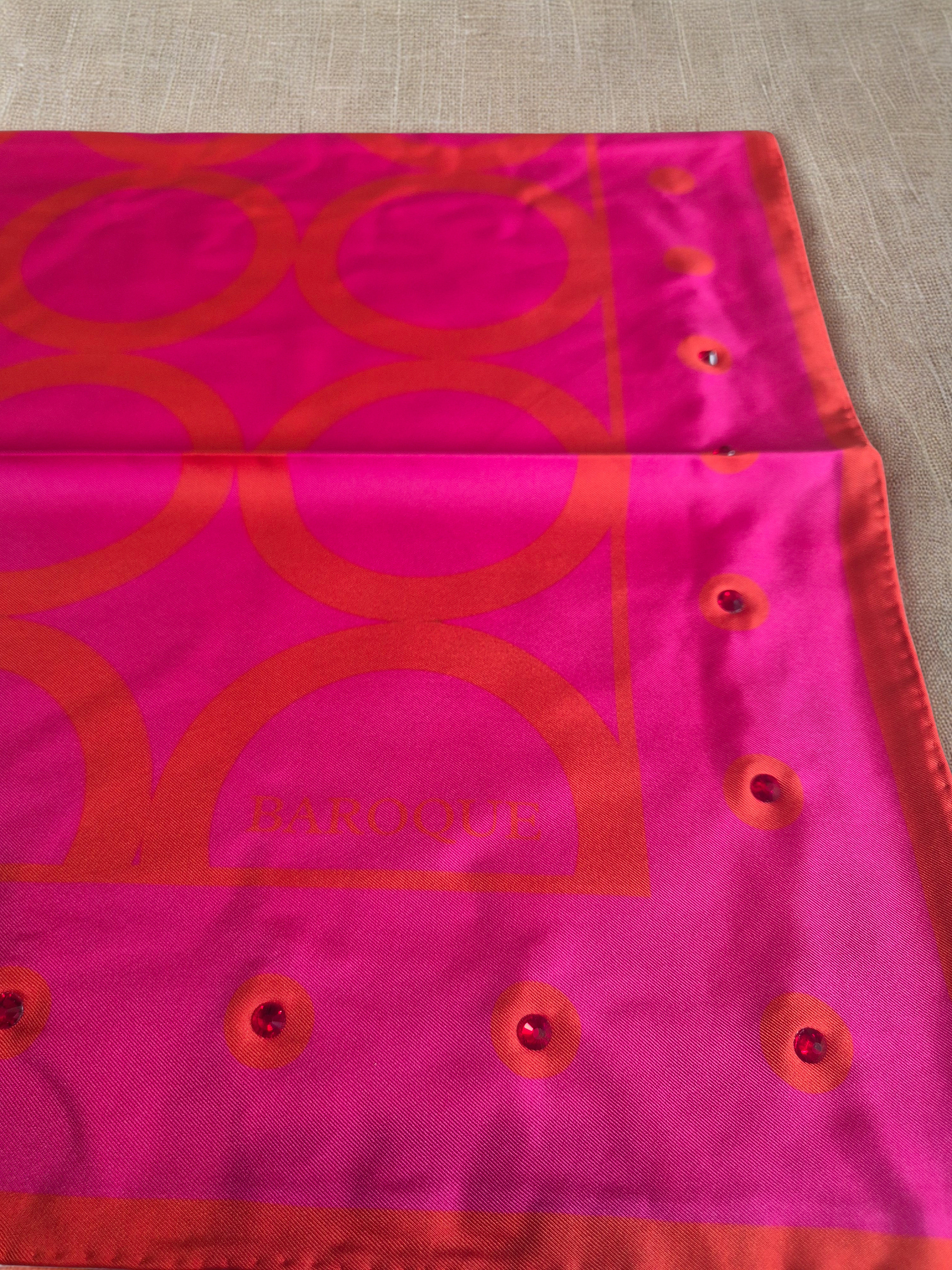 90x90 18mm twill with hand rolled edges & embellishments.