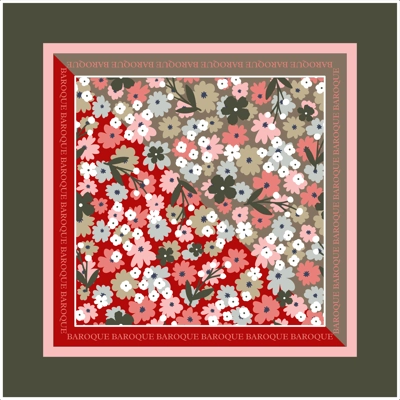 A striking army green border, accented with white, encircles a vibrant medley of pinks, cherry reds, taupe, and various shades of green. The flowers emerge beautifully from this colorful backdrop, creating a stunning scarf that complements a wide range of styles.