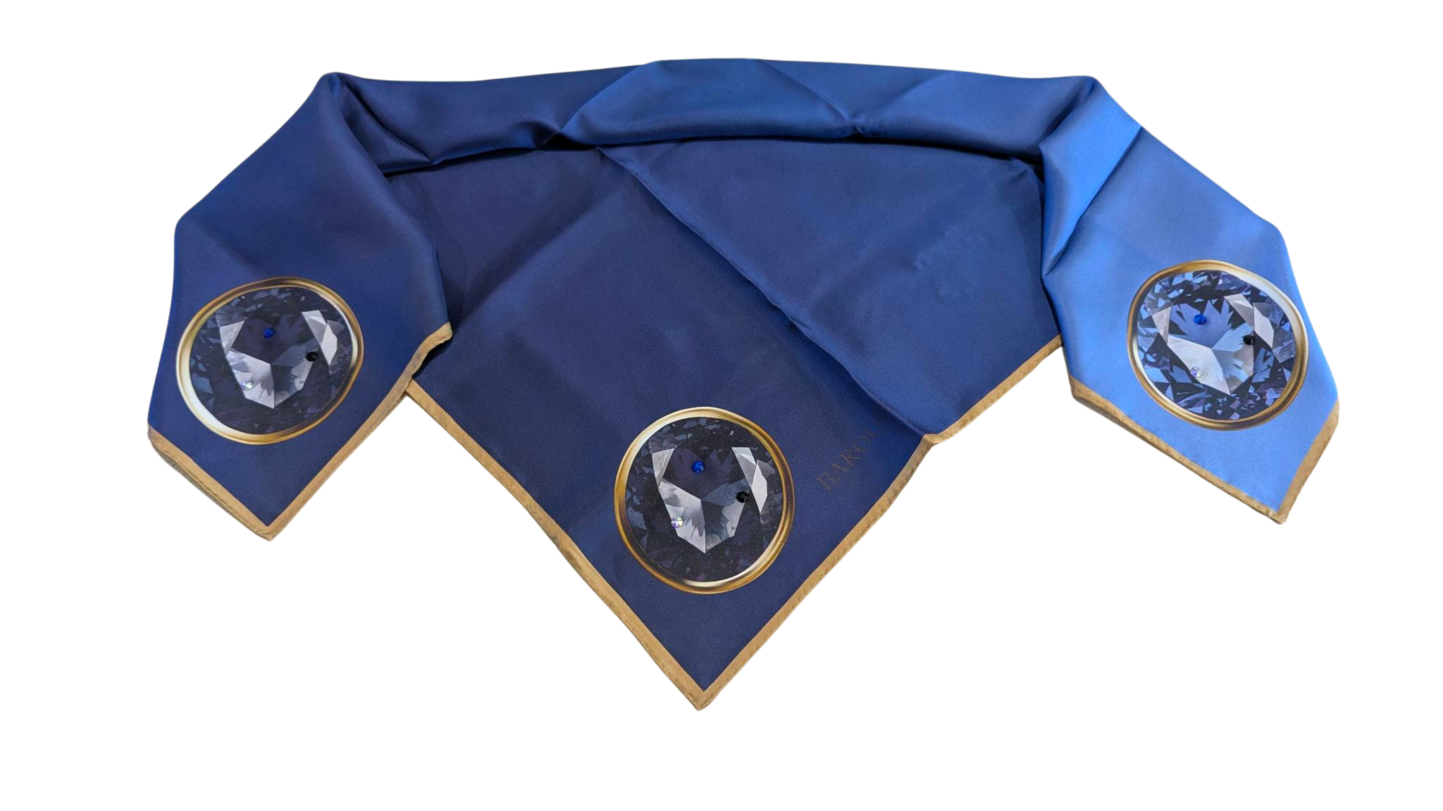 This stunning scarf features a striking variegated pattern that transitions beautifully from deep Navy to Blue, allowing each hue to stand out. It offers a unique two-in-one color option for those seeking a twist on the classic plain look. Adorned with a luxurious gold border, each corner showcases a diamond that echoes the scarf's gradient tones. The pièce de résistance is the addition of three 7mm diamonds in contrasting colors, elevating this seemingly simple accessory to extraordinary heights. Embrace your individuality and make a timeless investment in this scarf, where diamonds truly become a girl's best friend.