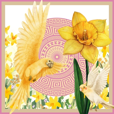 Step outside your door and be greeted by a stunning summer tableau painted in vibrant shades of yellow and pink. Nature showcases its splendor with bold, bright flowers and playful birds dancing in the warm sunlight. The striking white backdrop enhances the scene, while the lush green leaves add depth to this sunlit paradise.
