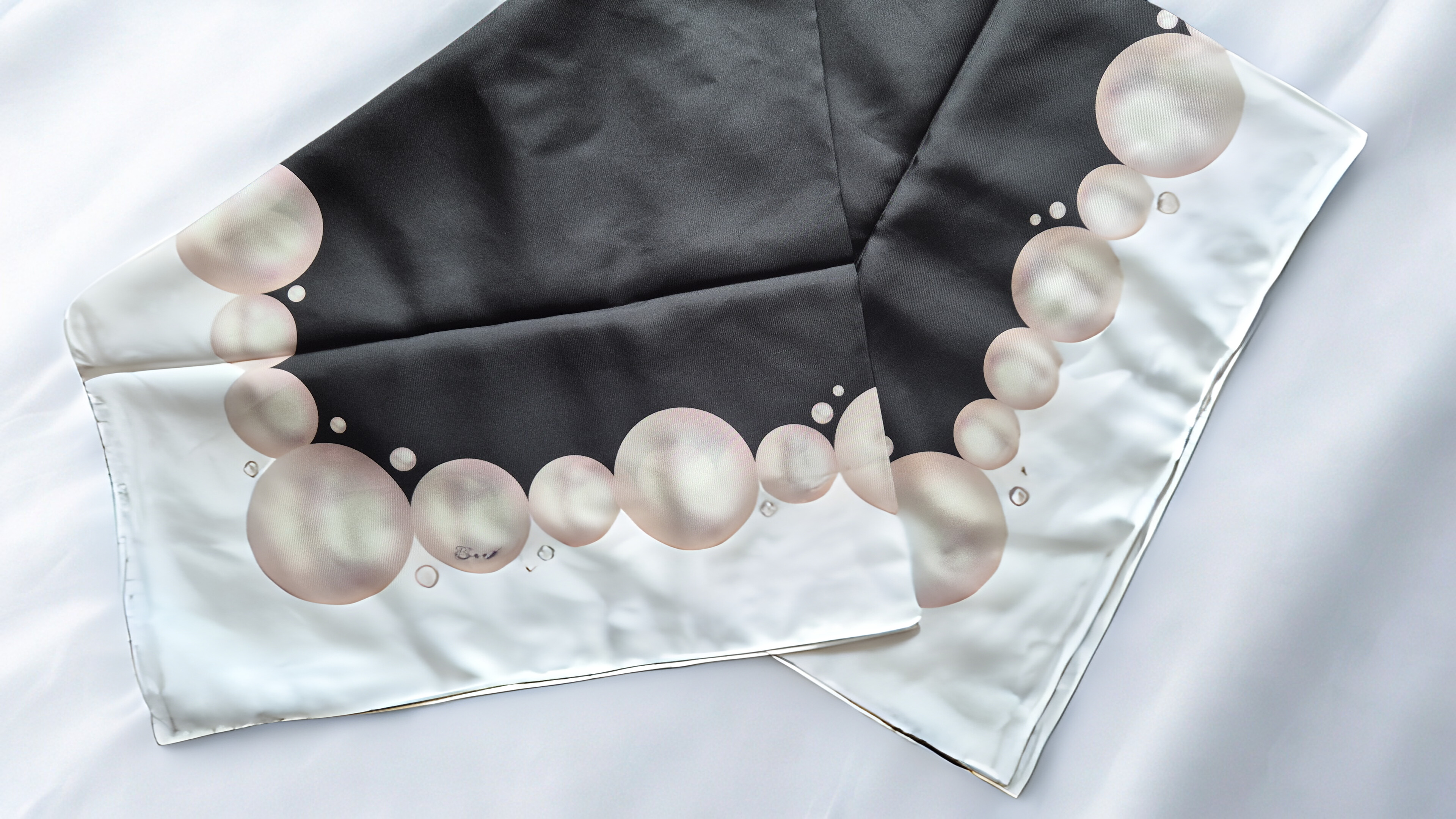 This exquisite two-tone scarf features bold contrast of black & white, creating a harmonious blend of color. The delicate pearl-like beaded border enhances its elegance, making this stunning accessory a perfect addition to any outfit.
